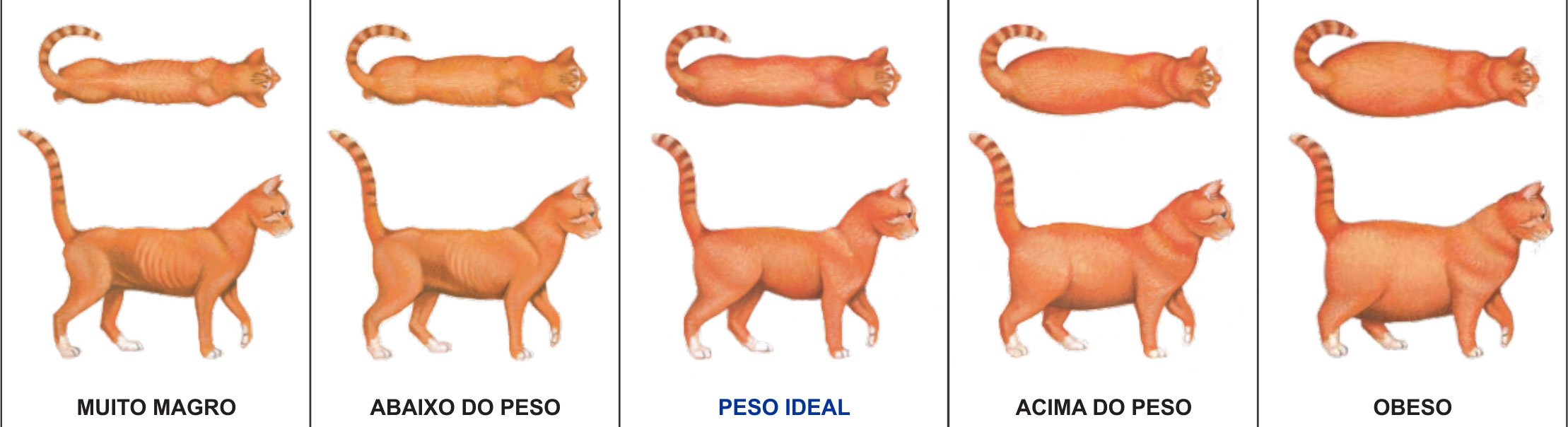Importante: apetite não é um bom termômetro – Gatos não como os cães, que são capazes de comer muito mais do que precisam em uma refeição. Normalmente a quantidade suficiente para um gato é o quanto ele consegue comer em 30 minutos, caso esteja sobrando a alimentação é um indicativo de que você esta oferecendo uma quantidade excessiva, contribuindo para a obesidade. Atente para a silhueta dele. Pets no peso saudável geralmente exibem uma cintura quando observados de cima e as costelas podem ser sentidas com uma leve pressão dos dedos, uma a uma. A perda dessas referências pode indicar que seu amigão está acima do peso. Guie-se pelas figuras abaixo.